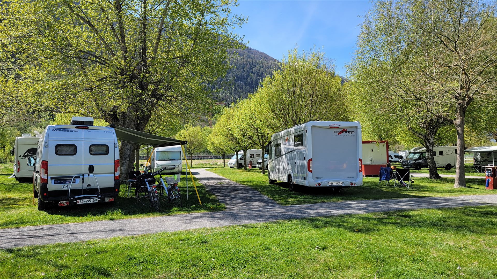 Am Ziel angekommen begrüsst uns sofort Schosi Rotzer, und erklärt uns, wo wir stehen können. Wir finden schnell einen geeigneten Platz, und richten uns ein. Anschliessend machen wir eine Besichtigung des Platzes und begrüssen die Kolleg:innen vom Wohnmobilland Schweiz.